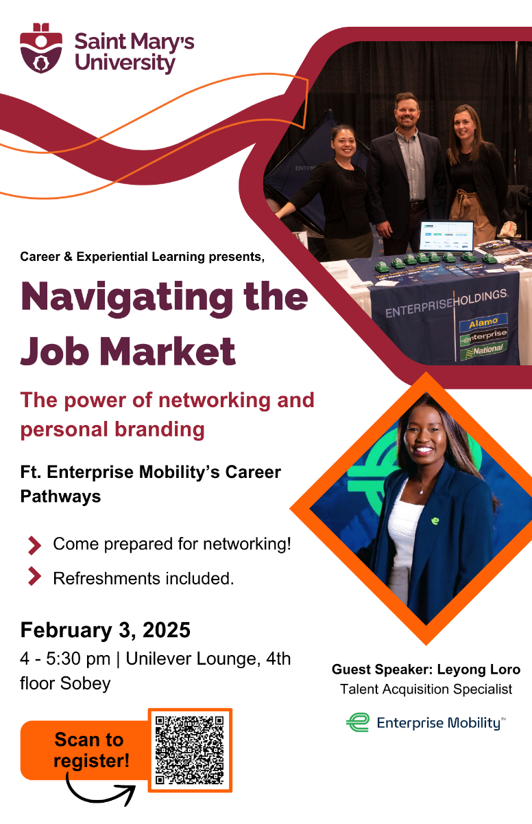 Join us for "Enterprise Mobility - Navigating the Job Market as a Newly Grad: The power of networking and personal branding " on Monday, February 3, 2025 at 4:00pm at the Unilever Lounge (4th floor of the Sobey Building).